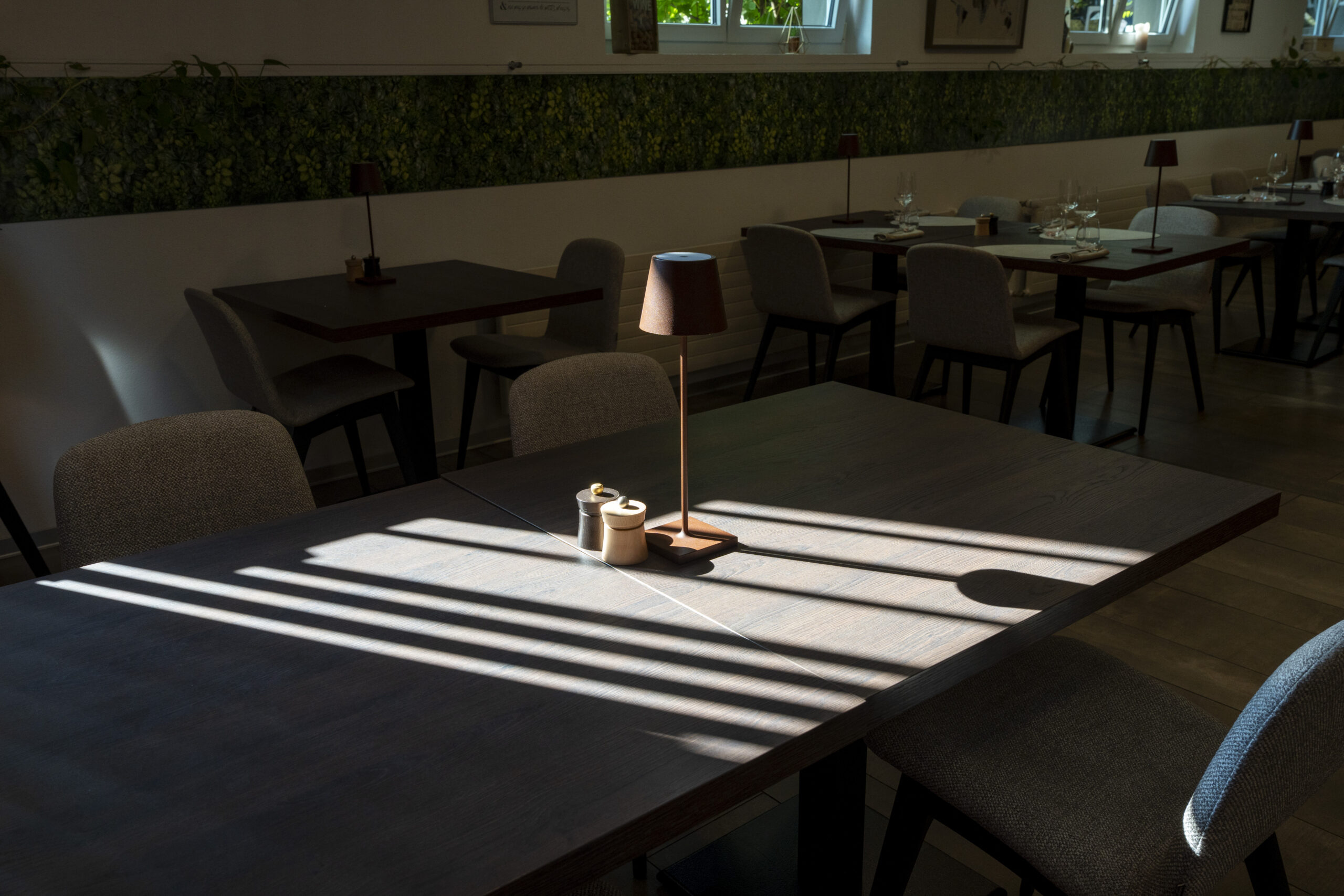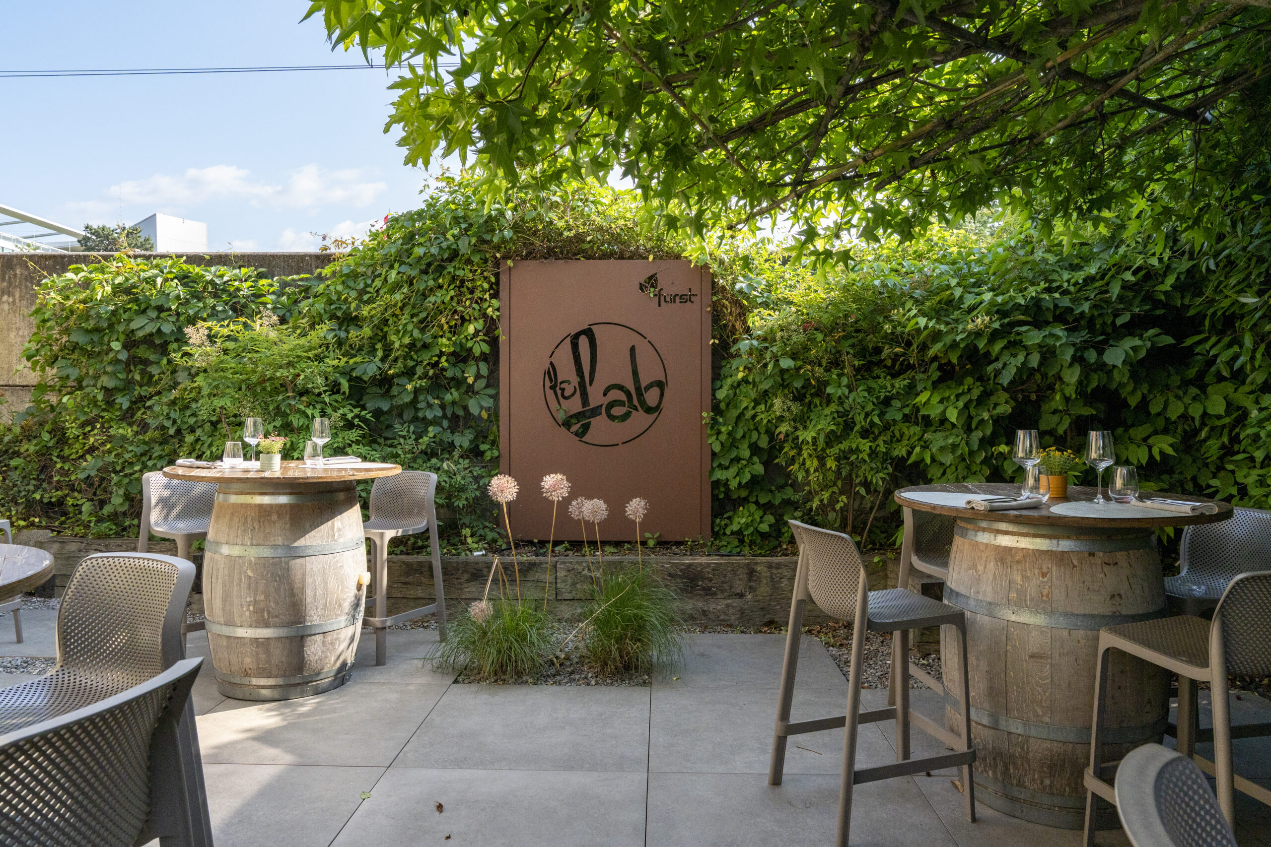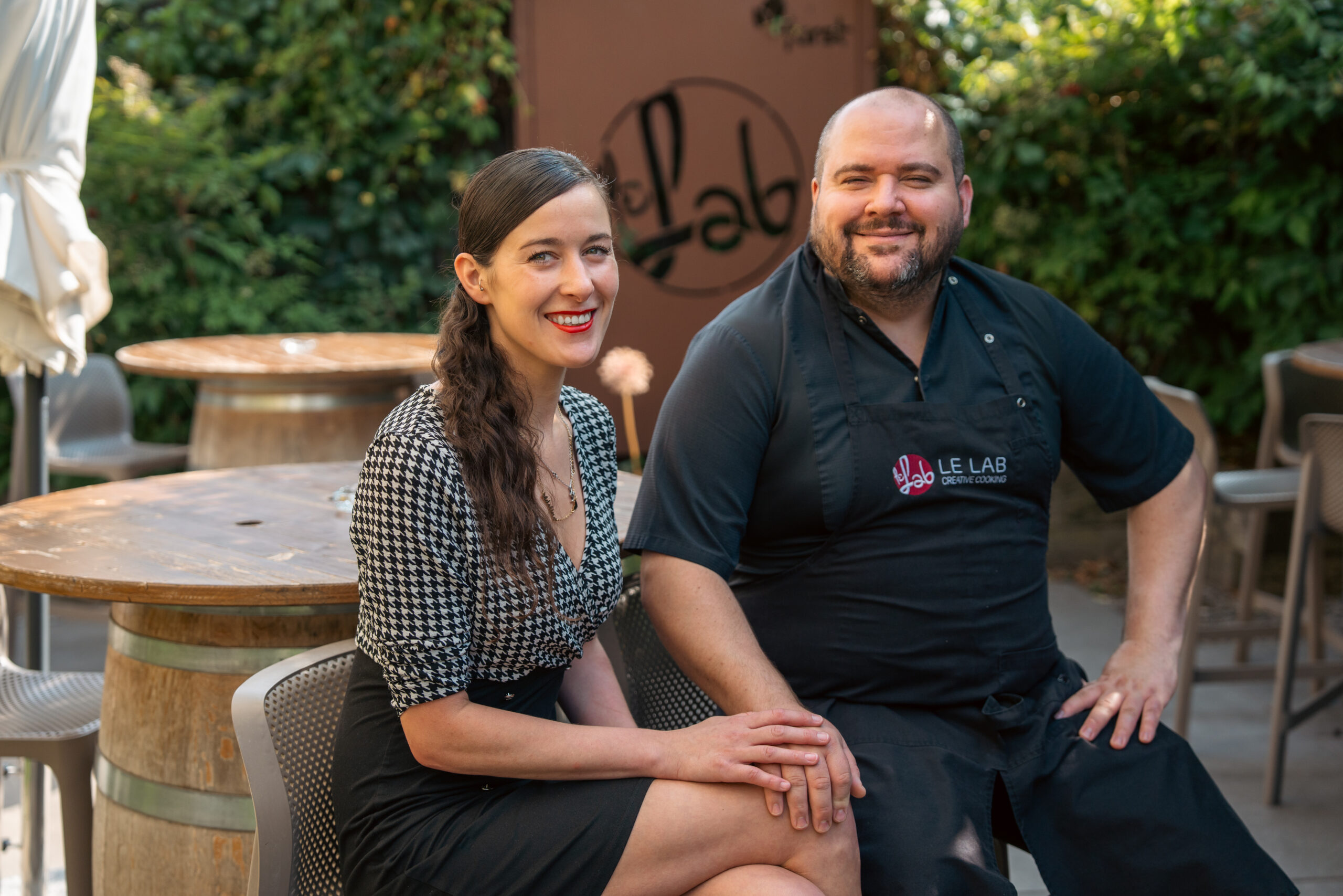 Niché dans un petit village entre Vevey et Montreux, Le Lab se cache dans un lieu insolite où l’on découvre d’abord une cuisine de 130 mètres carrés dédiée aux cours de cuisine et team building. Il faut ensuite descendre quelques marches pour accéder à un petit jardin verdoyant abritant des tables hautes, puis redescendre encore pour atteindre la salle du restaurant. A deux minutes du funiculaire et dix minutes de la gare de Vevey, le lieu, sobre et cosy, mise sur une atmosphère intimiste : chaque table bénéficie de son propre éclairage tamisé, ce qui permet aux clients d’échanger en toute convivialité autour des saveurs partagées. Car ici, l’art de vivre se conjugue autour de trois mots d’ordre : profiter, partager, trinquer. C’est à Champéry, en Suisse, que se sont rencontrés Adel et Nikola, avant de reprendre ensemble Le Lab il y a trois ans. En cuisine, Nikola, formé à l’école hôtelière de Bruxelles, exprime toute sa créativité. En salle, Adel, autodidacte passionnée, assure un service attentionné et accompagne chaque plat d’explications détaillées. Ensemble, ils ont développé une carte composée d’assiettes à partager, où chaque plat raconte une histoire de voyage et de rencontres. Parmi leurs assiettes signature, les croquettes de homard bleu à l’encre de seiche et écume coquillage-pastis illustre parfaitement leur approche : des origines belges revisitées avec une touche personnelle audacieuse. En effet, Nicolas puise son inspiration au gré de ses humeurs et des saisons, toujours en privilégiant le fait-maison.