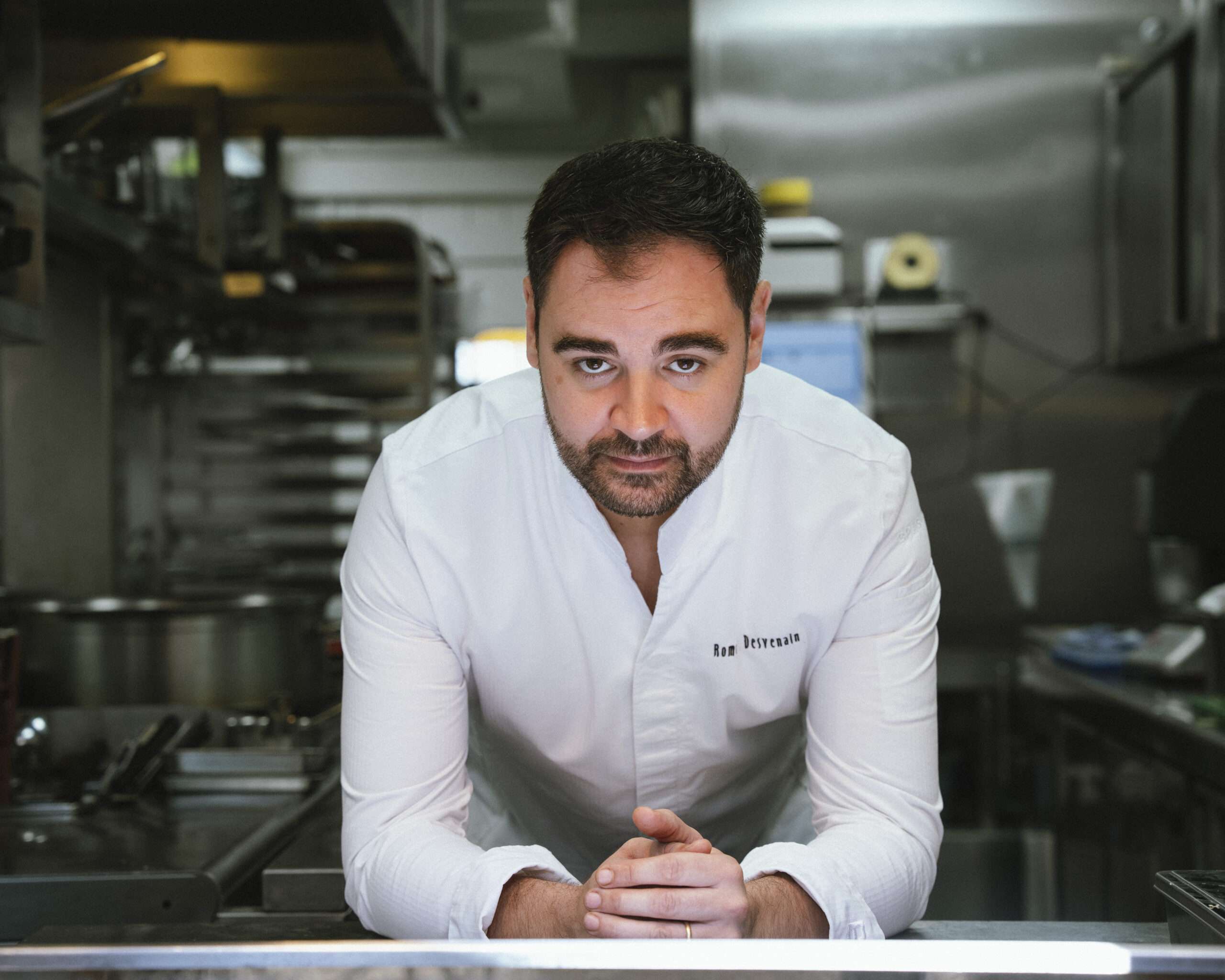 Ariégeois de naissance, Romain Desvenain se forme dans lycée hôtelier français avant d’officier à Eugénie-les-Bains auprès de Michel Guérard. Les briques rouges de Carouge lui rappelle sa région natale, il s’y installe en reprenant le Bistrot du Lion d’Or. Le chef y propose des spécialités françaises revisitées, comme cette Canette Apicius servies avec des asperges blanches des Landes et sa crème sous bise, un crumble de pain et de l’ail noir fermenté. Il soutient les producteurs de la région en s’associant avec la GRTA, Genève Région Terre et Avenir, tout en appréciant les contributions de ses voisins qui lui apportent des salades, des tomates et d’autres légumes de leurs jardins.