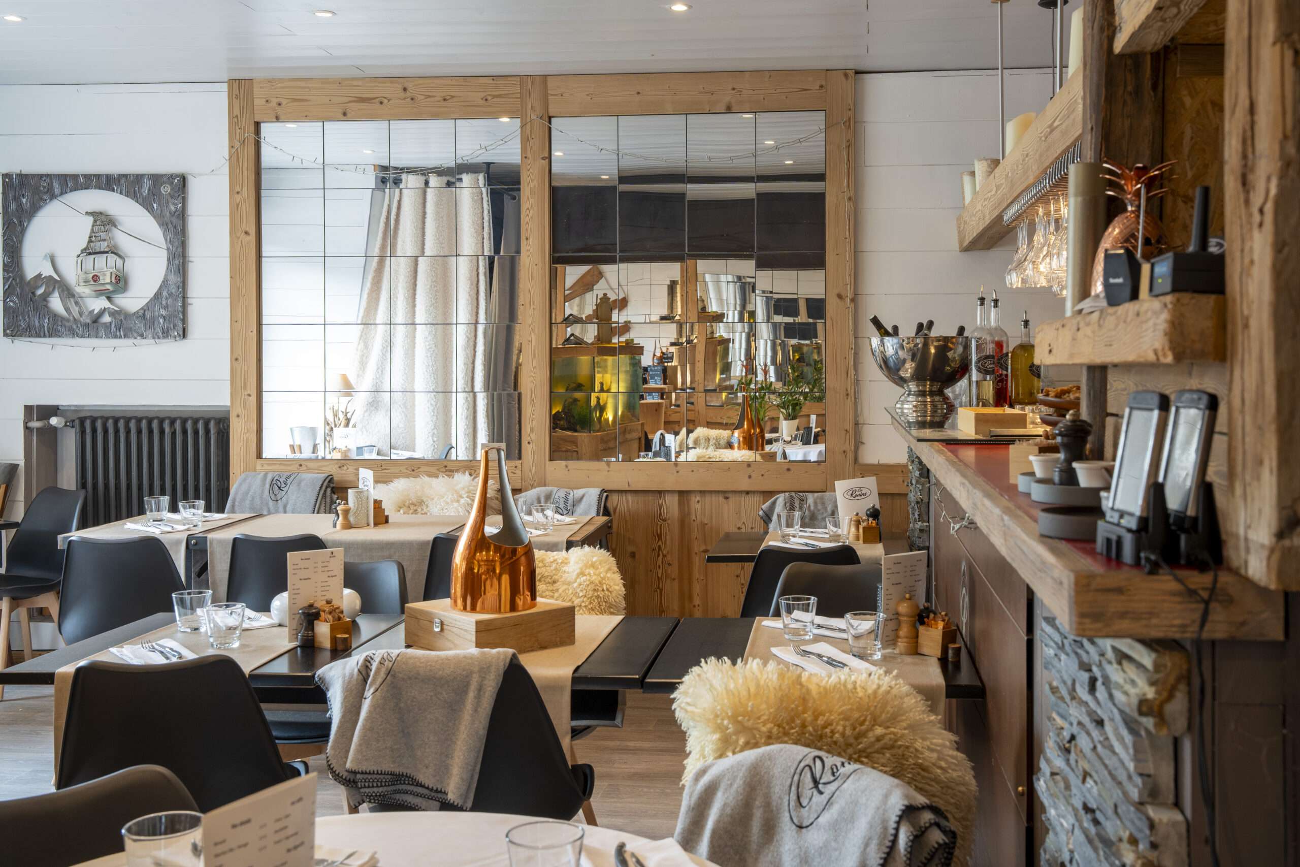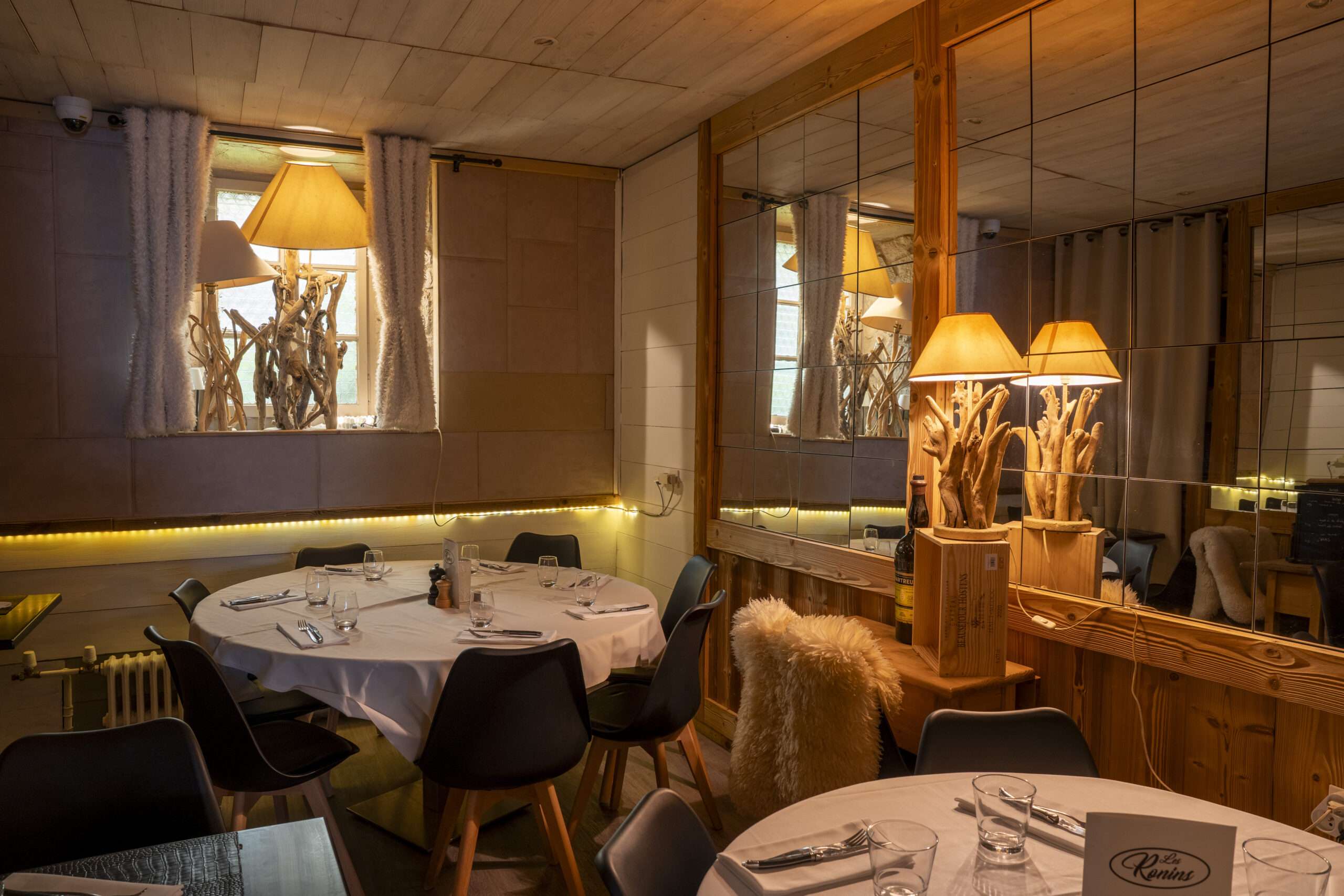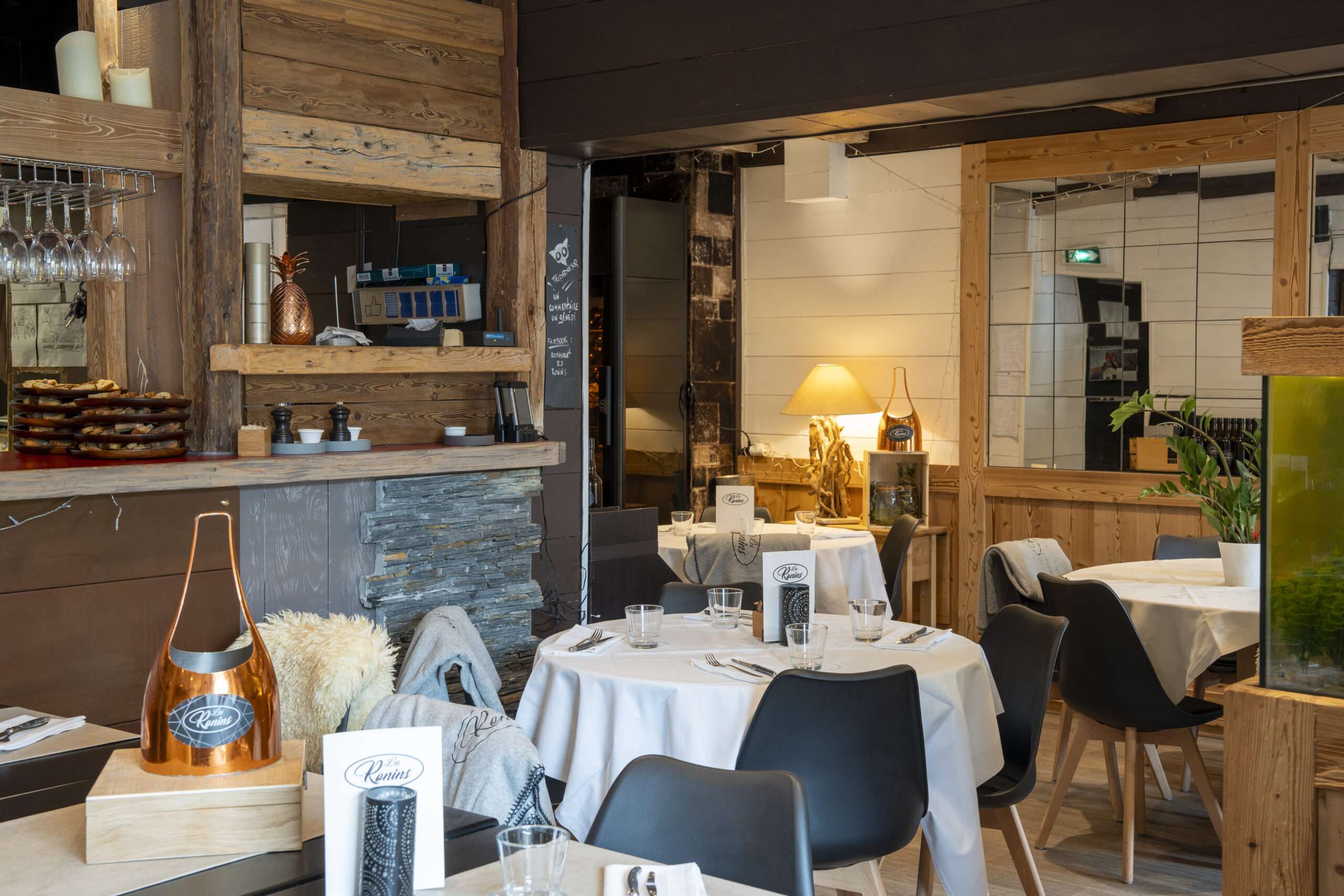 Le restaurant Les Ronins est niché au cœur de la station-village familiale de Praz-sur-Arly, à 1 036 mètres d’altitude. Dans un décor typiquement montagnard, le restaurant prend place dans un chalet au charme traditionnel, parfaitement intégré à son environnement naturel. À l’intérieur, le bois règne en maître et crée une ambiance moderne et réconfortante, idéale pour partager un moment gourmand après une journée en plein air. Le restaurant peut recevoir jusqu’à cinquante convives répartis dans la grande salle, auxquels s’ajoute la terrasse ombragée l’été.